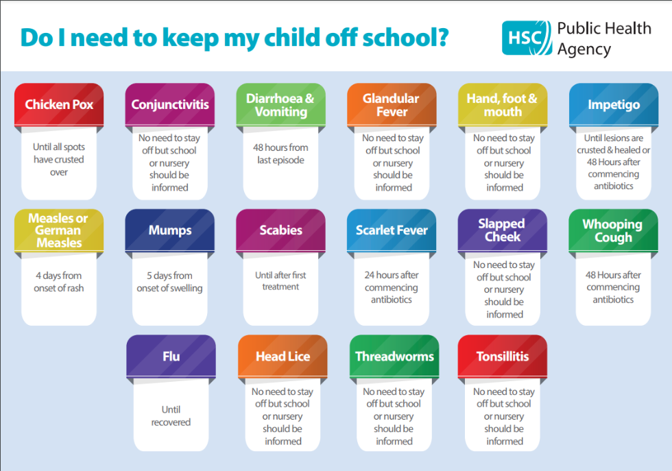 - Children should be kept at home if acutely unwell or infectious. (Please refer to the PHA guidance poster below: Do I need to keep my child off school?)